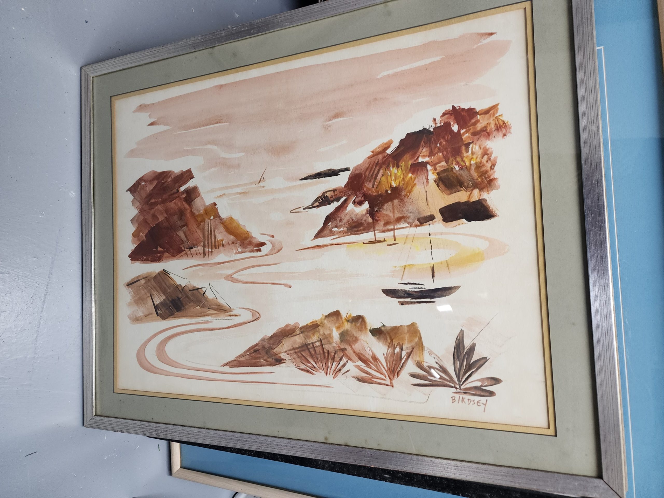 An expressive original watercolor by Alfred Birdsey (1912–1996), Bermuda’s most acclaimed modernist painter. This artwork captures a serene coastal inlet, with boats anchored in calm waters and bold, gestural brushstrokes shaping the rocky shoreline. The warm earth tones and fluid movement of the scene showcase Birdsey’s masterful ability to simplify form while retaining atmosphere.
