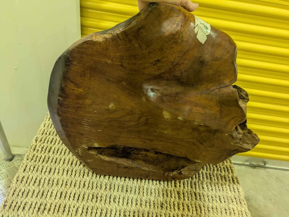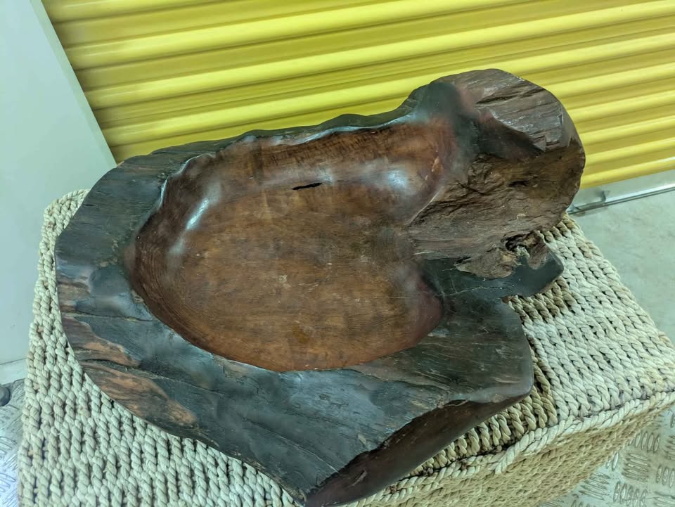 Beautiful, heavy solid-wood bowl carved from a single piece of timber. Features a rich natural grain, organic shape, and rustic live-edge detailing that makes it a striking decorative statement for any home. Perfect as a centerpiece, catch-all bowl, display piece, or for rustic / tropical / boho décor styling. Has natural imperfections, character cracks, and wear consistent with handcrafted wood — adds to its charm. Truly a unique piece, no two are alike.