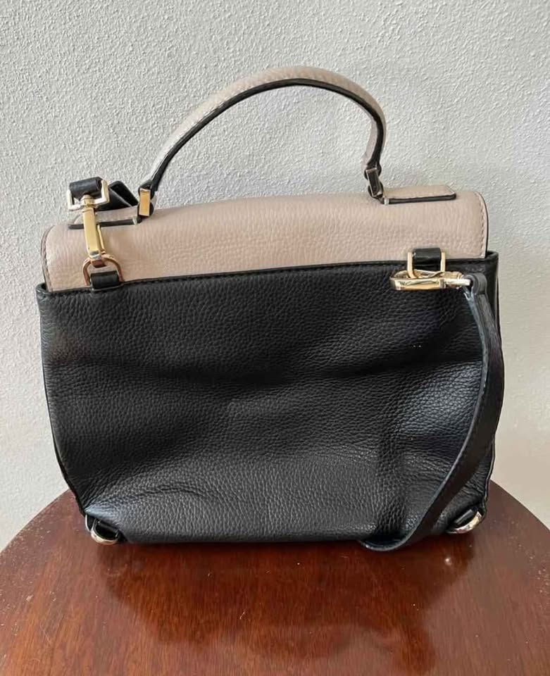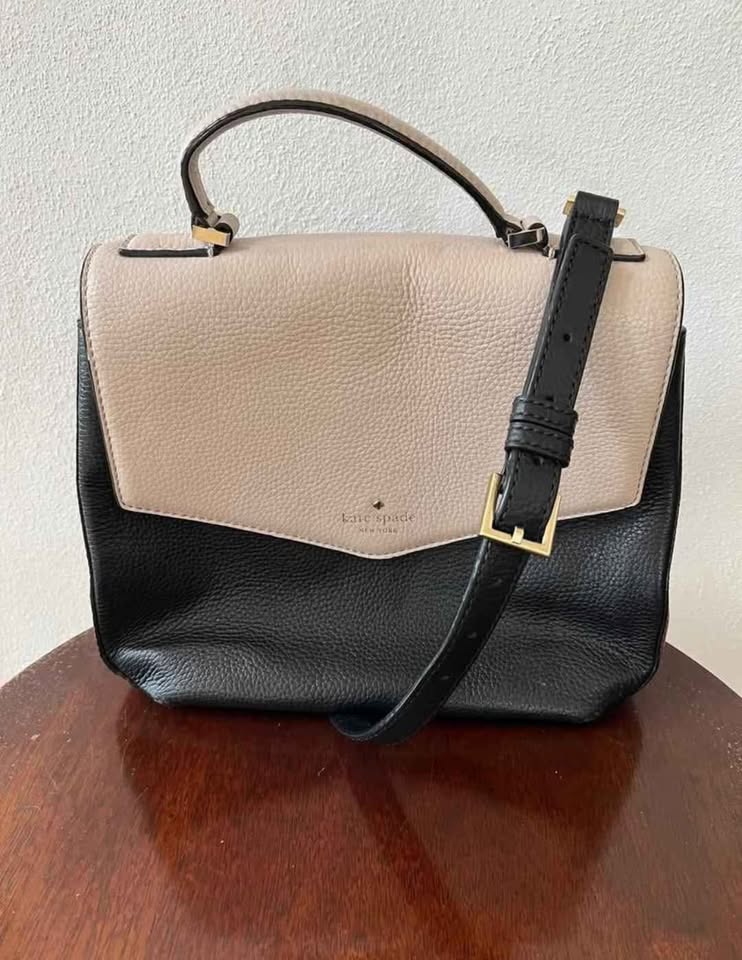 Beautiful, high-quality Kate Spade handbag in classic black and taupe pebbled leather with gold hardware. Can be worn as a crossbody with the adjustable strap or carried by the top handle. Spacious interior with multiple compartments and zip pocket. Clean inside, exterior in good condition with normal light wear.