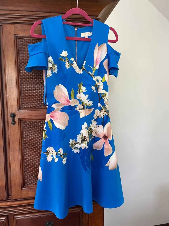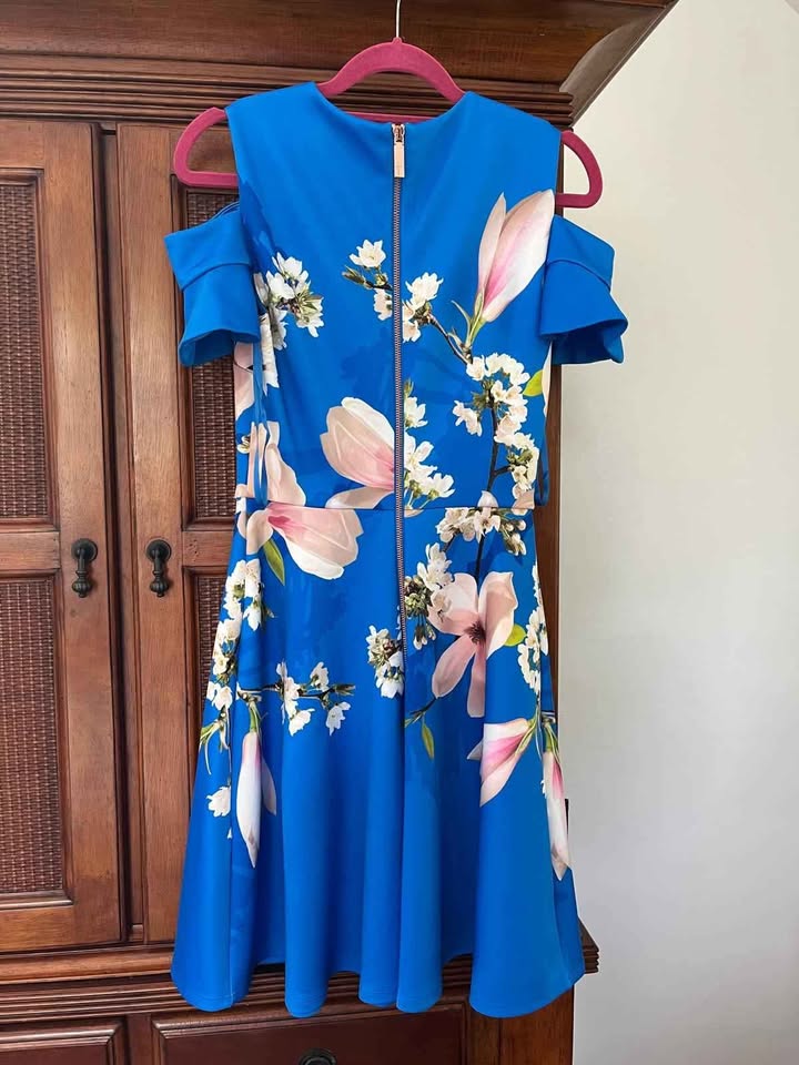 Gorgeous Ted Baker London dress in a vibrant cobalt blue with beautiful floral print. Features a flattering fit-and-flare silhouette, cold-shoulder ruffle detail, and elegant exposed zipper. Feminine, fun, and perfect for weddings, brunch, garden parties, date nights, or special events.